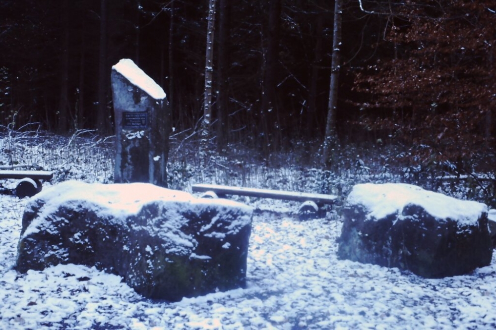 Wenn wir noch weiter wollen, biegen wir rechts ab und laufen ein paar Meter hinauf zur ehemaligen St.- Barbara- Kapelle. Ein kleiner Rastplatz lädt zum Verweilen ein. Nun folgen wir bis zum Ziel der blauen Raute und den Schildern „Ittersbach“. Ein kleines Stück begleiten uns die Infotafeln des „Baumartweges“. Auf gemütlichen Wald- und Teerwegen marschieren wir weiter, müssen einmal aufpassen, wenn unsere Markierung links abzweigt (leicht zu übersehen!), queren wenig später die Straße und gelangen zum Waldrand. Wer abkürzen will, kann hier nach rechts der gelben Raute zur S- Bahn- Haltestelle Spielberg folgen. Im anderen Falle hält man sich bei den nächsten beiden Wegweisern bei einem Waldspielplatz erst links („Ittersbach 4,0km“), dann rechts Richtung "Tornadostein", überquert bald bei einem Bahnübergang die Straße, genießt den schönen Blick auf die nördlichsten Schwarzwaldberge Mahlberg, Mauzenberg und Dobel und läuft auf Teerwegen über Wiesen wieder in den Wald. Bei einem kleinen Pavillon biegen wir links ab und marschieren auf breitem ebenem Weg an einem Lehrbienenstand vorbei zum Tornadostein. Er erinnert an den Tornado, der am 10. Juli 1968 wütete und unter anderem große Waldflächen vernichtete.
