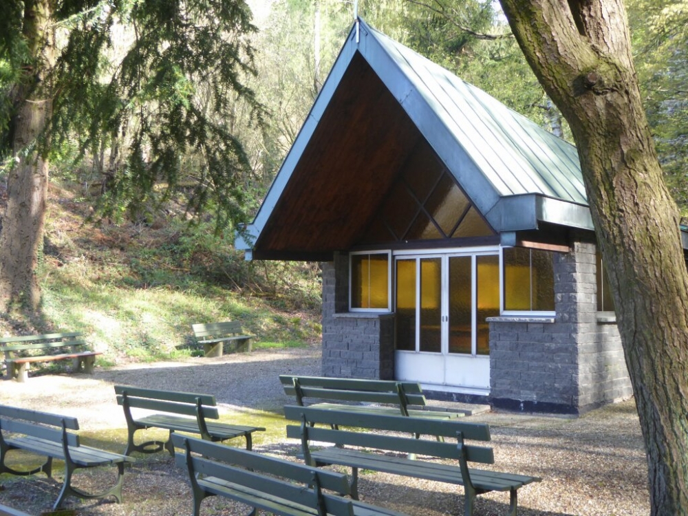 Nun gehen wir auf dem Anstiegsweg zurück zum Waldparkplatz, biegen rechts ab und folgen weiterhin der gelben Raute („Fatimakapelle 1,9 km“) auf einem Waldpfad in vielen Kehren anfangs steil bergab, dann auf allmählich breiterem Weg zur kleinen Fatimakapelle.