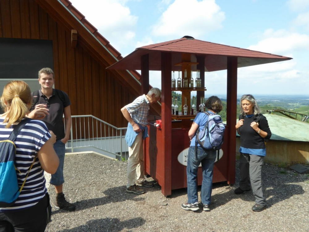 Vor dem Bahnhof halten wir uns rechts, nach 100 m nochmals rechts und gehen über den Bahnübergang und die Renchbrücke. Nun folgen wir für die nächste Stunde der gelben Raute und den Wegweisern „Geigerskopfturm“: geradeaus auf der Oberdorfstraße, rechts in die Ketteler Straße, rechts in die Heimkehrerstraße, beim Hotel Renchtalblick zweimal links und biegen nach 300 m rechts ab auf einen Waldpfad. Im Zickzack geht’s durch den Wald recht steil bergan zur Albersbacher Höhe und weiter bergan durch den Wald zum Waldrand. Weiter unserem Zeichen nach, nun auch als Oberkircher Brennersteig markiert, durch Weinberge zum Kölbelesberghof mit einem Schnapsbrunnen zur Selbstbedienung. Wir wandern weiter aus aussichtsreichen Weg zum Buseck und gelangen wenig später zu Geigerskopf mit seinem luftigen Aussichtsturm, mit 435 m dem höchsten Punkt unserer Wanderung.