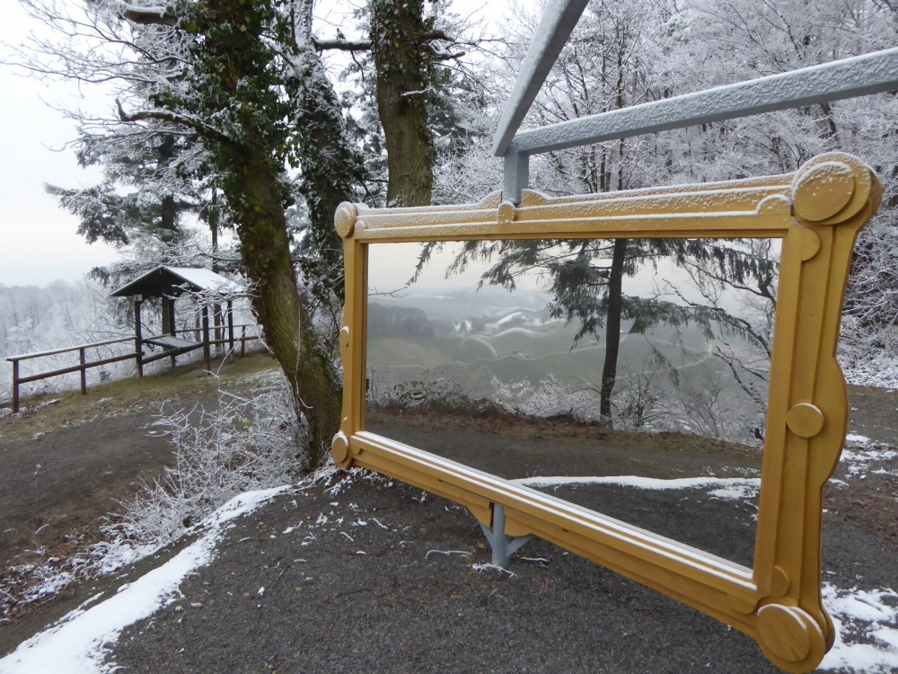 Wir laufen von der Bushaltestelle ein paar Meter auf der Straße weiter, biegen links ab in die Klosterstraße („Märchenwald“) und laufen immer geradeaus aus dem Ort zur Erholungsanlage Schlosswiesensee. 50 m nach der Infotafel biegen wir links ab auf einen Fußweg und folgen ihm am Seeufer entlang. Kurz nach einer kleinen Brücke wählen wir den Teerweg geradeaus parallel zu einem Bächlein, halten uns bei einer Bank links und sofort wieder rechts und beim Radwegweiser geradeaus (Skulptur „Weitblick 1,2 km“). Vorbei am Bienengarten und der Gaststätte Weiss stoßen wir wenig später auf den Eppinger Linienweg. Er ist mit dem Wachturmzeichen markiert und begleitet uns bis zum Ziel. Wir biegen links ab („Eppingen 15,3 km“) und wandern auf breitem Forstweg (gleichzeitig schön angelegter Waldlehrpfad), immer unserem Zeichen folgend, sanft bergan durch den Wald zu einem Aussichtspunkt bei der Spiegelskulptur „Weitblick“.