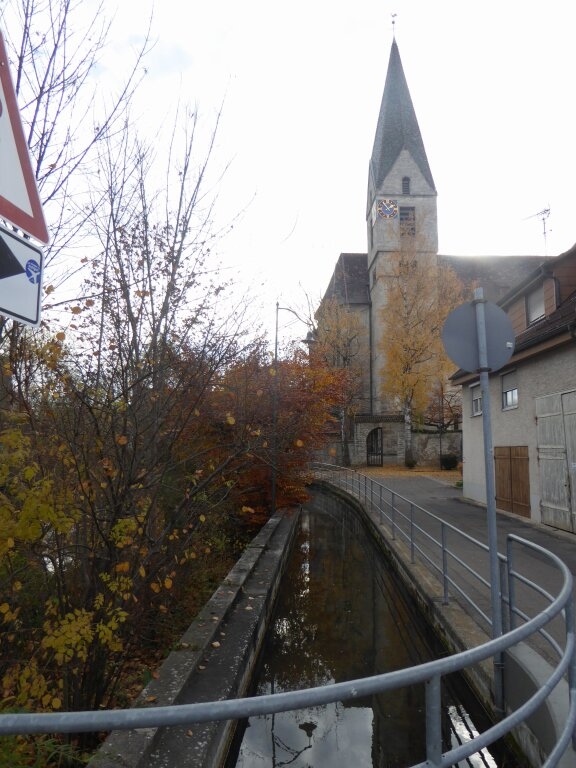 Markierungszeichen sind nun leider Mangelware, wir laufen auf Wegspuren den Grashang hinab, bleiben links etwas unterhalb des „Bölle“ und gelangen auf einen Schotterweg, der ein paar Meter weiter links von einem Wirtschaftsgebäude auf einen Teerweg trifft. Wir halten uns links, bei einer Bank nochmals links und gleich wieder rechts und marschieren auf Owen zu. Bei den ersten Häusern folgen wir dem roten „Y“ nach rechts, dann links bergab auf der Straße „Im Grund“ und der Weinbergstraße, beim Gasthof Adler rechts und gleich wieder links in die Beurener Straße. Gleich nach der Brücke schwenken wir nach rechts in den Fußweg parallel zum Mühlkanal und laufen an der Gemeindewaage vorbei und bei der Kreissparkasse links zum Bahnhof.