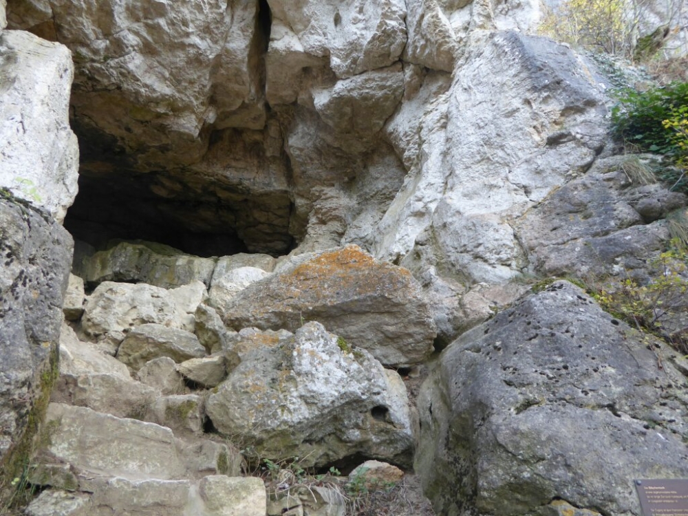 Wir gehen zurück zum Eingang, halten uns links und folgen dem Schild „Sibylenhöhle“ auf einem Pfad bergab zur sagenumwobenen Höhle. Wir umrunden auf dem Pfad die Burg, gelangen wieder auf den Anstiegsweg, laufen zurück zu der Verzweigung, die wir vorhin gemerkt haben und folgen dem roten quer liegenden „Y“ in mehreren Kehren hinab zum Wanderparkplatz „Bölle“, wo sich ein herrlicher Ausblick auf Owen und die kleine Erhebung „Bölle“ (der Hügel genau in Blickrichtung zur Kirche) öffnet.