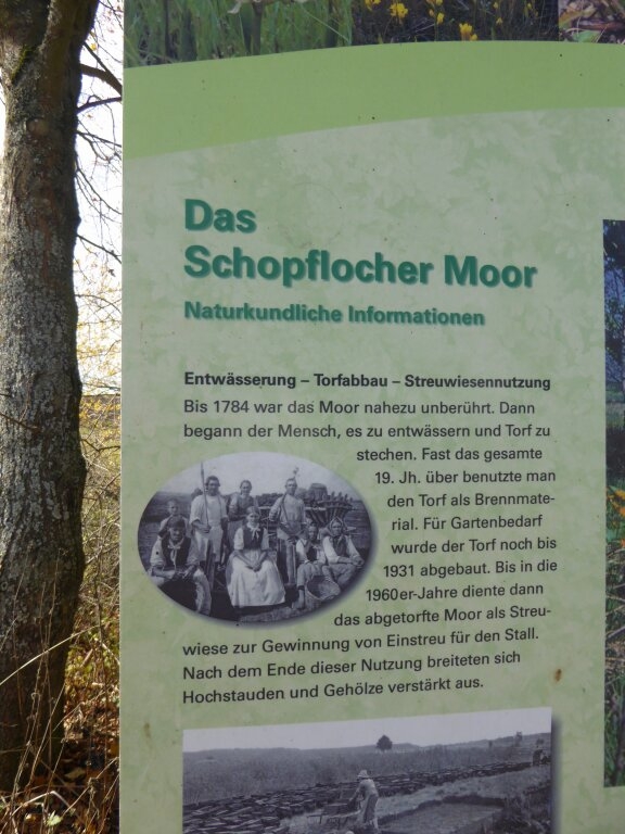 Nun marschieren wir immer geradeaus, den Schildern „Schopflocher Moor“ folgend, auf Teer- , Schotter- und Grasweg, biegen 50 m nach einem Hochstand rechts und beim nächsten Querweg links ab. Wenig später verlassen wir den Wald und treffen auf einen geteerten Querweg. Auf ihm gehen wir geradeaus bis zu den Infotafeln zum Schopflocher Moor, wenige Meter vor dem Gasthaus Albengel (Einkehrmöglichkeit). Wir schwenken nach links auf einen Graspfad (beim Schild Naturschutzgebiet), der wenig später in einen einmalig schönen Bohlenweg mitten durch das Naturschutzgebiet Schopflocher Moor übergeht.