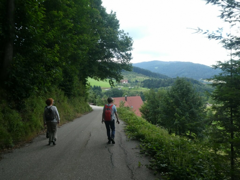 Wieder zurück zur Hütte folgen wir weiter der gelben Raute und nun immer den Schildern „Kreuzbuch“ nach auf herrlichem Felsensteig hinauf zum Naturdenkmal Fuchsschroffen, dem höchsten Punkt unserer Wanderung, dann bergab über einen Querweg hinweg am Naturdenkmal „Katzenstein“ vorbei zum nächsten Querweg und auf ihm links zur Wegspinne Kreuzbuche. Hier biegen wir rechts ab und folgen der gelben Raute und immer den Schildern „Schönbüch“. Achtung: es zweigen nach rechts zwei Pfade ab, wir wählen den rechten steil bergab führenden Pfad und marschieren immer geradeaus auf allmählich breiterem Weg zum Wegweiser „Hinterer Wasen“. Hier gehen wir 5 m nach rechts, beim roten Hydranten links und wandern auf schönem Waldpfad oberhalb der Straße, zum Schluss ein paar Meter auf der Straße zur Höhensiedlung Schönbüch. Wir biegen scharf links ab („Seebach 4 km“), laufen 300 m auf der Straße zu einem Bildstock, schwenken nach rechts und folgen der gelben Raute und den Schildern „Seebach“ anfangs rechts steil bergab, begleitet von einem murmelnden Bächlein zum Börsighof, biegen links und beim Wegweiser Grünwinkel rechts ab und laufen auf einem Sträßchen zur Vollmers Mühle. Wir überqueren den Grimmerswaldbach und folgen nun immer den Schildern „Ottenhöfen“ auf schönem Talweg am rauschenden Bach entlang an einem Schnapsbrunnen und einer Lourdesgrotte vorbei, biegen beim Wegweiser „Am Schrotten“ rechts ab und, nun der blauen Raute nach, zum Gasthof Kreuz, queren die Straße („Ortsmitte 1 km“) und eine Bachbrücke und laufen rechts parallel zum Bach, vorbei an einer alten Hammerschmiede und der evangelischen Kirche (sie wurde nach dem Vorbild norwegischer Stabkirchen erbaut) nach Ottenhöfen, biegen bei der katholischen Kirche rechts und nach einem kleinen Teich links ab und gelangen zum Bahnhof.