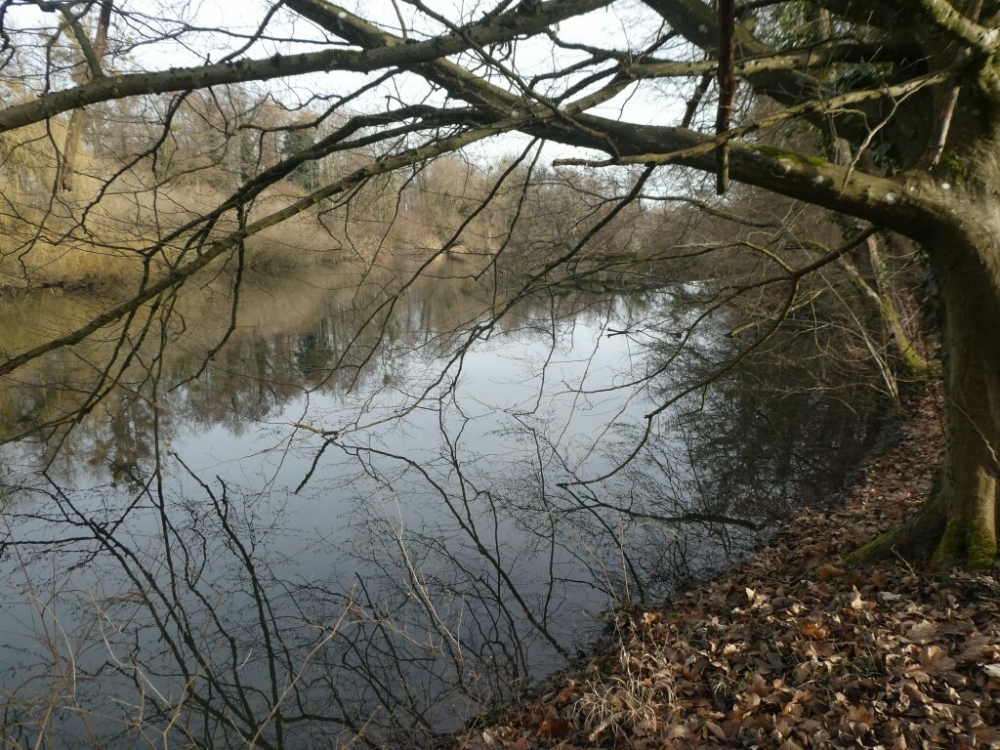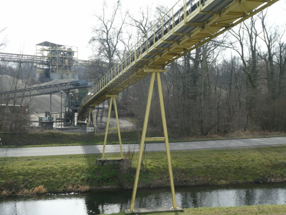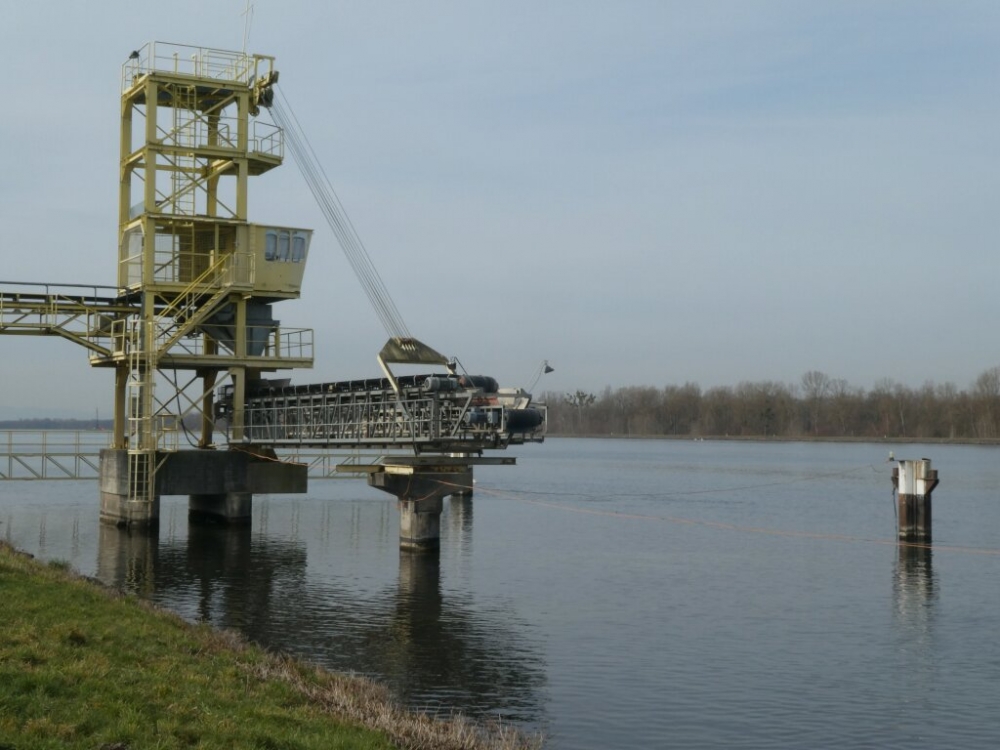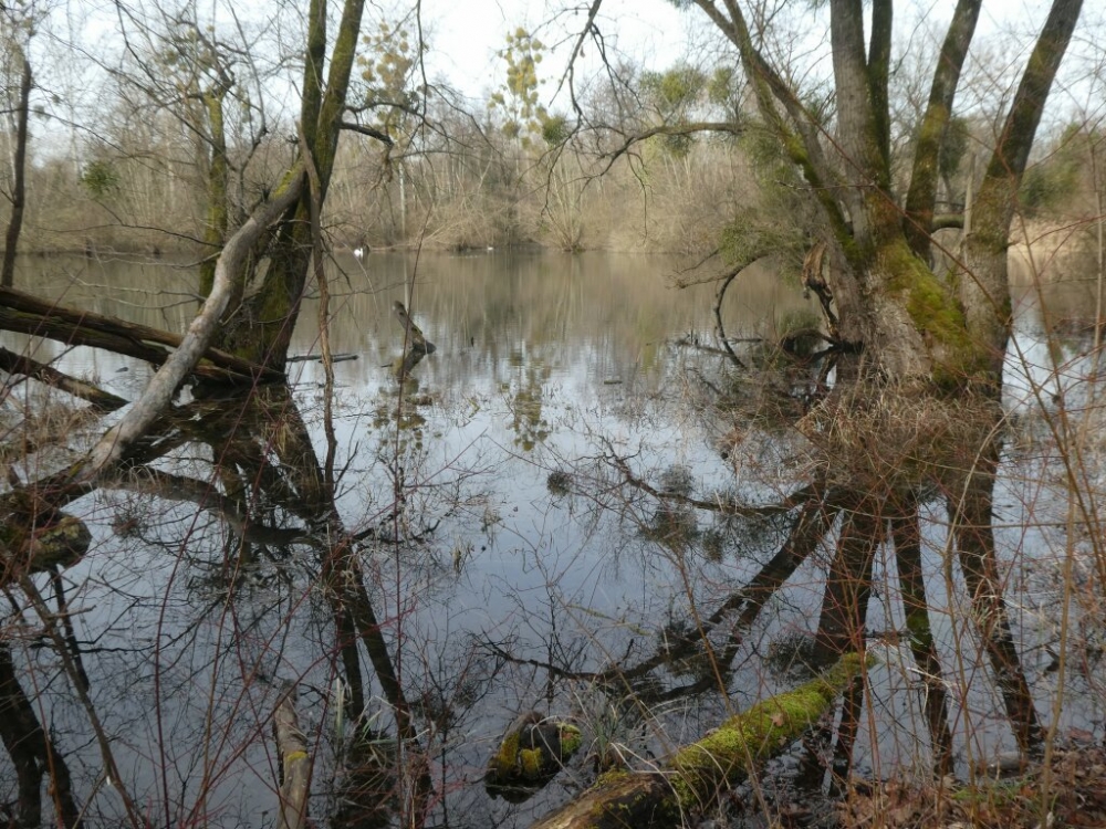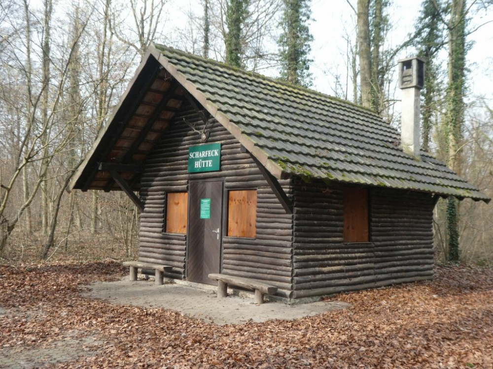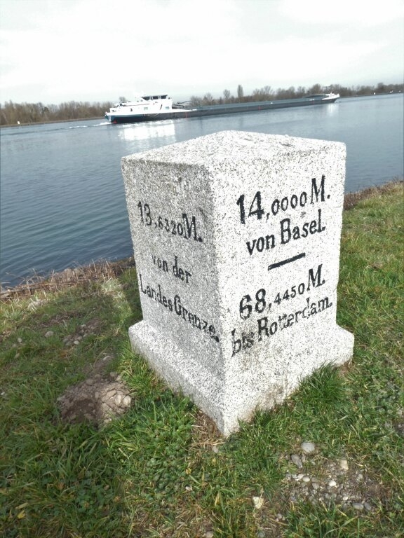 Kurz nach der Rheinkies- Umschlagsanlage schwenken wir nach links, queren nochmals die Straße, halten uns nach 200 m rechts und wandern auf schönen Wegen an der Scharfeckhütte vorbei. Bald treffen wir wieder auf den Hochwasserdamm. Wenn wir abkürzen wollen, bleiben wir geradeaus, treffen nach 130 m wieder auf unsere Markierung und lesen beim übernächsten Absatz weiter. Im anderen Falle biegen wir scharf rechts ab, wandern an Feldern und Streuobstwiesen entlang wieder zum Hochwasserdamm. Hier kann man mit einem kurzen Abstecher den See- Imbiss am Honauer Badesee erreichen. Wir marschieren weiter auf oder neben dem Damm, queren einen Teerweg und eine Straße und laufen an einem großen Baggersee entlang, bis uns nach 400 m die Markierung nach links schickt. Auf Graswegen gelangen wir zum Ortseingang von Honau bei der Tafel vom versunkenen Kloster.