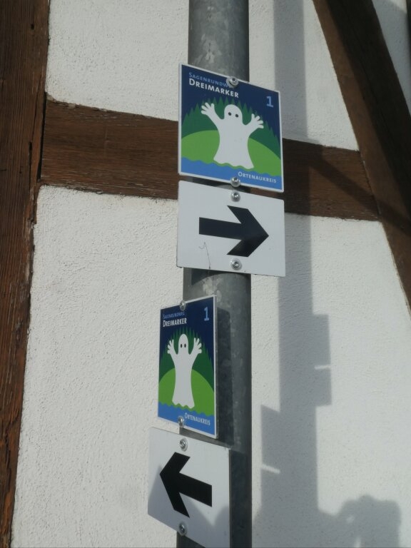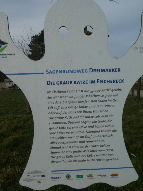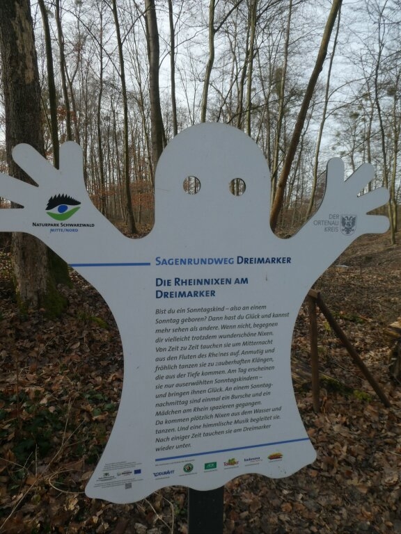 Wir laufen von der Bushaltestelle „Kirche“ ein paar Meter auf der Straße zurück am Grießmuswickler- Denkmal ("Grießmuswickler" ist ein Nickname der Diersheimer) und Rathaus vorbei, biegen beim ehemaligen Gasthaus Rappen rechts ab und folgen nun der zuverlässigen Markierung „Sagenweg Dreimarker“, sie wird uns bis zum Ziel begleiten. Bei der sehen wir schon die erste Sagenwegtafel („Die graue Katze vom Fischereck“). Bald überqueren wir den Hochwasserdamm, biegen nach 100 m rechts ab und wandern an einem Sportplatz vorbei an einem Altrheinarm entlang durch den Wald, dann 600 m auf dem Damm und schwenken beim Sagenwegschild „Ilwedritsche“ nach links. Nun geht’s, immer unseren Zeichen nach, auf schönen Wegen durch eine urige Auenlandschaft mit Altrheinarmen und Seen, queren bei der Tafel „Rheinnixen“ eine Straße und marschieren auf den Rheinuferdamm nach links. Bei einem Myriameterstein (die Steine stehen alle 10 km am Rheinufer) steht die Tafel mit der gruseligen Geschichte vom Hakenmann.