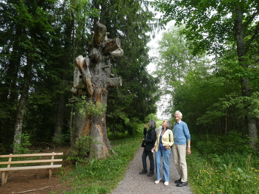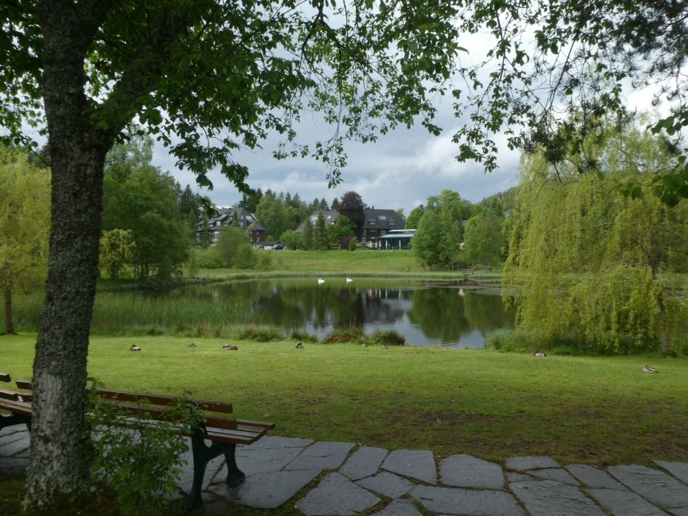 Weiter geht’s auf herrlichen Waldpfaden, immer in leichtem Auf und Ab, über die Bergrücken der Heizmanns- und Bruderhaldenhöhe hinab zum Waldrand beim Bankenhansenkreuz. Mit schönem Blick auf den Hochfirst. Hier schwenken wir nach links („Titisee Ort 2,4km“) und wandern unserem Zeichen nach zunächst noch eben an einer Steinmannfamilie vorbei, dann bergab am Campingplatzgelände entlang und an einem kleinen Weiher vorbei zu einer Straße. Hier halten wir uns links (verblasste Markierung) und gleich wieder rechts und marschieren an einem Aussichtspunkt mit schönem Blick auf den Titisee vorbei hinab zur Straße und auf ihr nach links zum Strandbad. Hier zweigt nach links ein mit gelber Raute markierter Weg Richtung Hinterzarten ab. Wenn wir abkürzen wollen, schwenken wir hier nach links und lesen beim nächsten Absatz weiter. Wenn wir den Ort Titisee noch einbeziehen oder zum Bahnhof wollen, bleiben wir geradeaus, gehen beim Café Bruggers rechts hinab zum See und auf der Uferpromenade durch einen Tunnel zum Hauptplatz. Wenn wir die Wanderung beenden wollen, biegen wir links ab in den Herrmanshofweg und folgen den Schildern zum Bahnhof. Wollen wir noch weiter, schließen wir uns dem Touristenrummel an, schwenken scharf links in die Seestraße und folgen der roten Raute links auf die Strandbadstraße und rechts auf der Alten Poststraße zum Wegweiser Bruggerwald. Der Westweg zweigt hier rechts ab, wir bleiben aber geradeaus und folgen nun der gelben Raute Richtung Hinterzarten am Eisweiher vorbei zum Wegweiser „An der Langmatte“ (hierher gelangt am auf dem direkten Weg ab Strandbad).