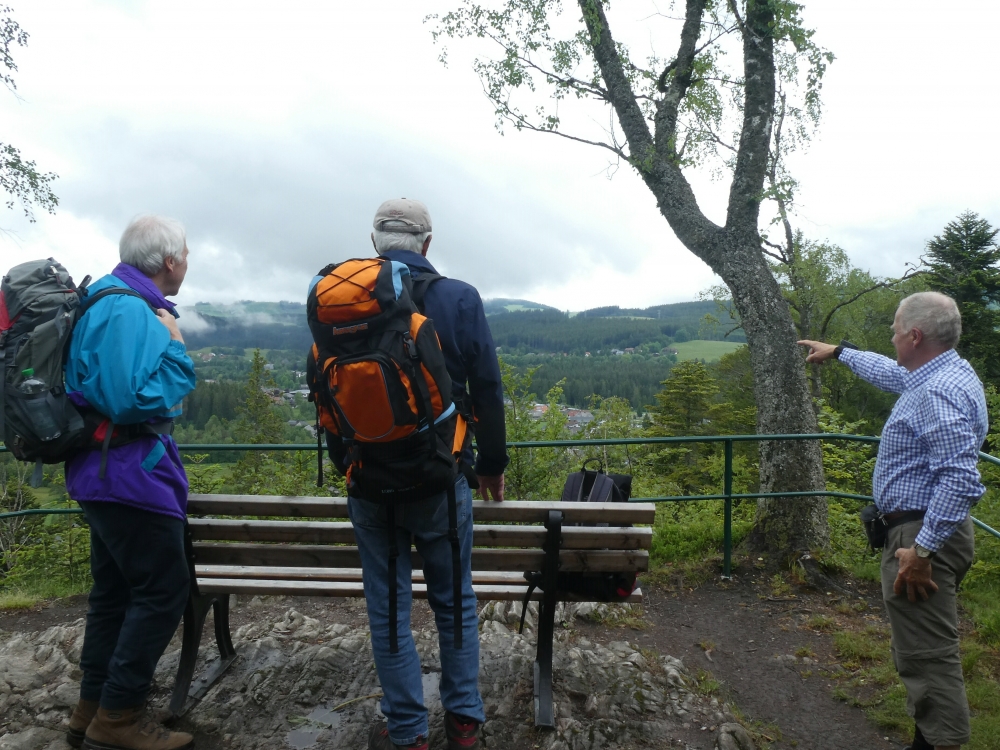 Vor dem Bahnhof sehen wir schon die Wegweiser des Schwarzwaldvereins, biegen links ab und folgen zunächst der weiß/roten Raute des Querwegs Freiburg-Bodensee („Titisee Ort 7,5km“) am Adlerplatz und der katholischen Kirche vorbei, schwenken nach dem Friedhof nach links und laufen auf einem Forstweg zur Wegkreuzung „Hellblech“, wo wir auf die rote Raute des Westweges treffen, sie wird uns bis Titisee zuverlässig den Weg weisen. Wir biegen scharf links ab und steigen einen steilen Waldpfad hinauf zum Aussichtspunkt Scheibenfelsen mit schönem Blick hinab nach Hinterzarten. Nun können wir erst einmal einen Blick auf die imposante Anlage der Adlerschanze werfen, bevor wir der roten Raute („Titisee Ort 4 km“) hinauf zur Kesselhöhe folgen, womit der anstrengendste Teil der Tour geschafft ist.