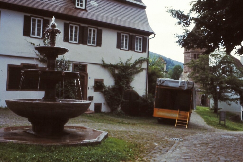 Bei der Bushaltestelle (Mo-Fr Busverbindung nach Calw) biegen wir rechts ab („Schweinbachtal 2km“) und laufen zum Waldrand. Bei einer Bank geht’s links ab durch ein Wäldchen auf eine Wiese zu. Diese überqueren wir (hier fehlt die Markierung), biegen beim nächsten Querweg links und gleich wieder rechts ab und folgen den Schilden „Steinernes Brückle“ auf breitem Weg bergab. Nach gut 10 Minuten heißt es aufpassen: Wir zweigen halblinks vom breiten Weg ab (gelbe Raute, „Hirsau 4km“- Achtung: leicht zu übersehen!) und wandern auf holprigem und steinigem, aber sehr reizvollem Fußweg das wildromantische Schweinbachtal hinab, wechseln unzählige Male über Holzbrückchen die Bachseite, bis der Fußweg in einen breiten Forstweg mündet. Auf ihm laufen wir noch ein Stück talabwärts, halten uns kurz vor den ersten Häusern halbrechts und gelangen, immer unserem Zeichen folgend, in einer knappen halben Stunde in den Ort Hirsau. Hier sollten wir uns genügend Zeit nehmen, die Klosteranlage und die Aureliuskirche zu besichtigen, bevor wir über die Nagoldbrücke und durch die Unterführung zum Bahnhof laufen. Die Züge der Nagoldbahn fahren hier immer 36 Minuten nach jeder vollen Stunde nach Pforzheim, von dort fährt man mit der S- Bahn oder dem Regionalzug zurück nach Karlsruhe.