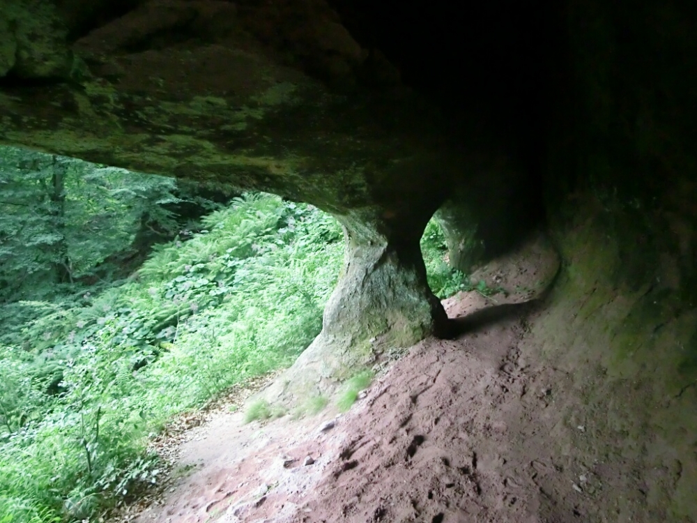Wir biegen links ab („Teufelsmühle 1,5 km“) und steigen einen steilen, steinigen Pfad bergan. Ein paar Meter weiter zweigt kann man .- gute Trittsicherheit vorausgesetzt! - nach links einen kurzen Abstecher zu den Teufelslöchern (vom Quellwasser des Laufbachs eingegrabene Hohlräume im Sandstein) machen. Wenn wir auf einen Querweg treffen, halten wir uns links und gleich wieder rechts und folgen unseren Zeichen noch ein Stück bergan, dann auf ebenem Weg zum Grenzertparkplatz mit einer kleinen Sternwarte der Astronomischen Vereinigung Karlsruhe. Nun kann man abkürzen und halbrechts auf direktem Weg zur Teufelsmühle gelangen, versäumt dann allerdings ein besonders schönes Wegstück.